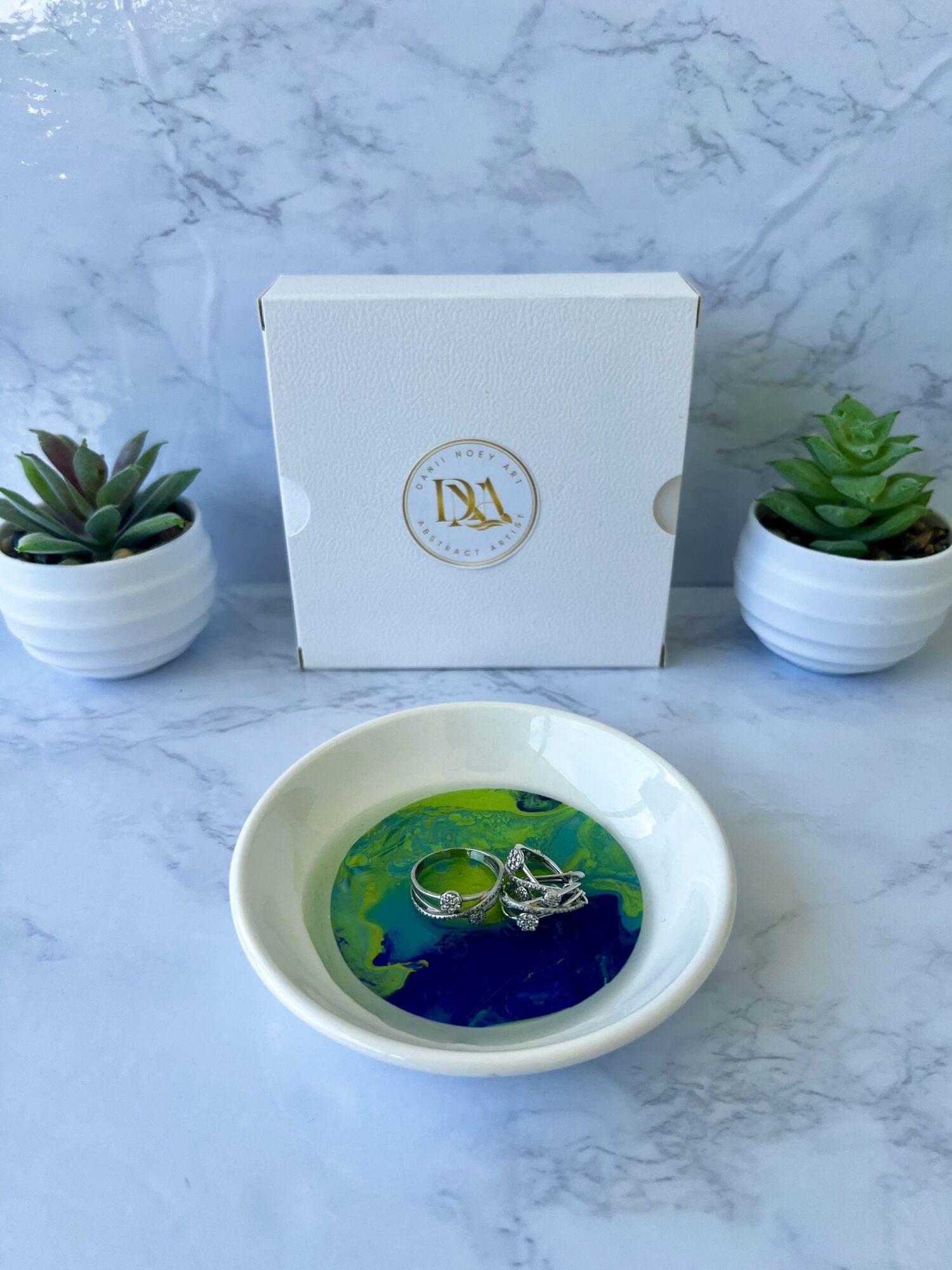 Keep your jewelry beautifully organized with this handmade 4-inch ceramic ring dish, perfect for storing rings and small accessories. Each dish is carefully crafted with unique abstract designs, adding a touch of art to your vanity or bedside table. Please note, colors may appear slightly different in photos but are often more vibrant in person. As with all handmade items, small imperfections may occur, enhancing the unique charm of each piece.